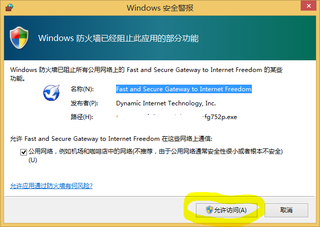如果Windows防火墙在运行,第一次运行还会出现如下的提示窗口,这是因为自由门使用了一些P2P的突破封锁技术造成的,点“允许访问”以后就不会出现防火墙提示了(需要管理员权限)。
